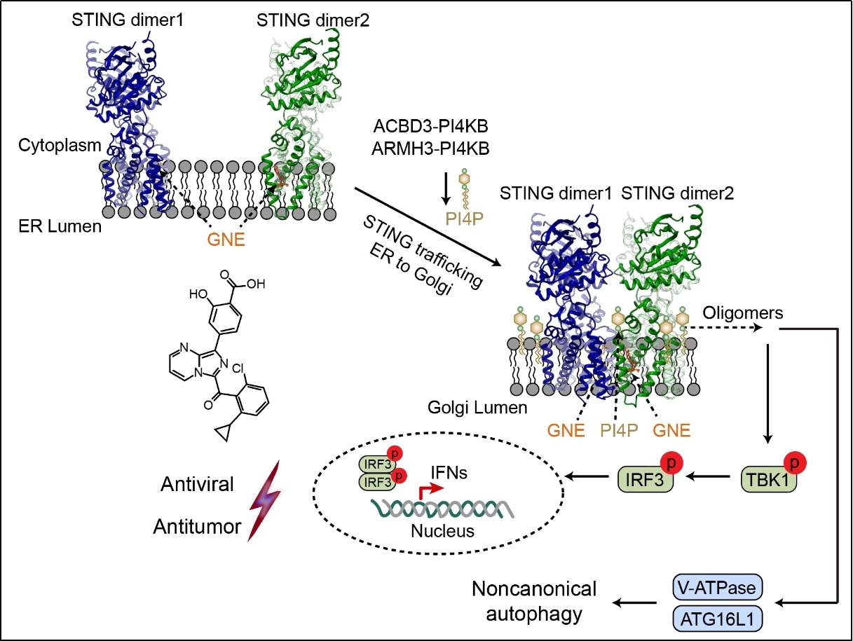研究成果以“STING新型激动剂与高尔基体PI4P诱导跨膜区变构激活天然免疫”(A chemical agonist and the Golgi-resident lipid PI4P activate STING by inducing transmembrane helix rearrangement)为题,以研究论文形式于12月5日发表于《免疫》(Immunity)。