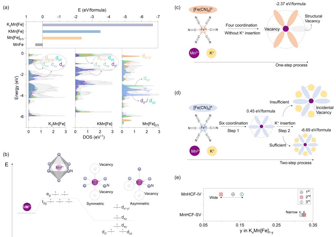 研究团队针对普鲁士蓝结构中的阴离子空位存在形式及其调控开展研究。通过解析锰基普鲁士蓝在合成生长过程中空位的潜在形成机制,提出了一种基于反应物价态调控的策略,实现了结构型空位的可控生成。研究证实,该有序排列的空位为离子传输提供了额外的转移路径,并且能够缓解充放电过程中的相变,从而有效提升循环和倍率性能。