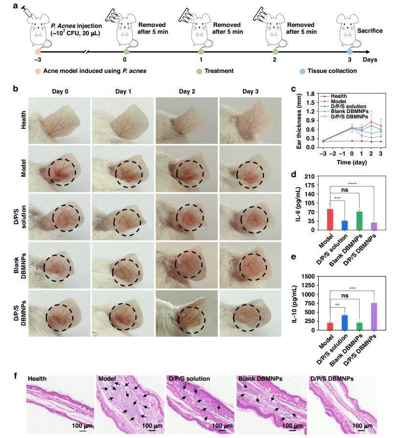 研究团队通过建立小鼠耳部痤疮模型,系统探究了其在痤疮治疗中的功效。实验结果表明,载药的DBMNPs显著优于传统外用药液组,其生物相容性良好,能够显著降低痤疮部位促炎因子IL-6,提升抑炎因子IL-10的表达,使用三天后几乎完全清了除病灶部位的痤疮丙酸杆菌,具有良好的痤疮治疗效果。
