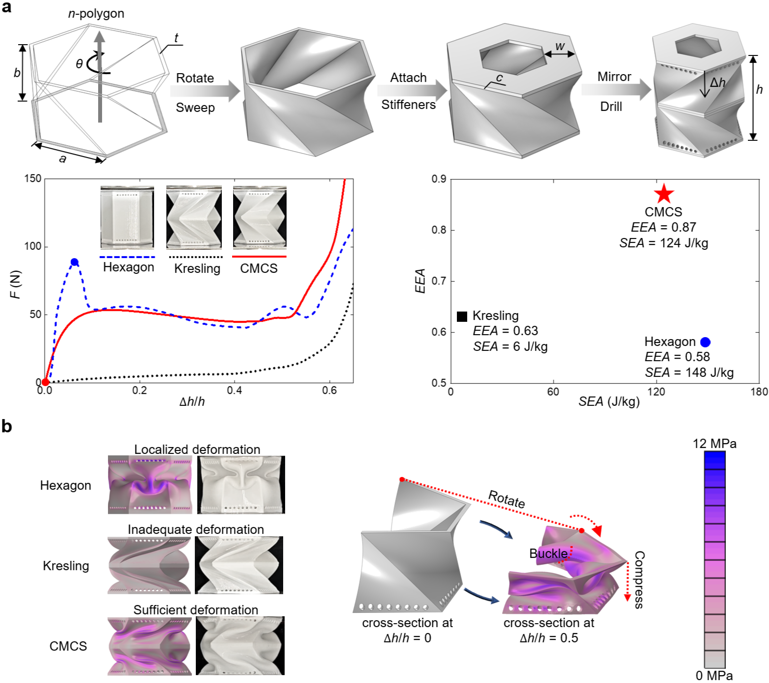为此,清华大学航天航空学院柳占立课题组与合作者提出了一种手性多曲壳(Chiral Multi-Curved Shell,CMCS)超材料,通过压扭与屈曲机理的协同耦合,实现了“高承载力-平滑吸能曲线”的统一,并在此基础上兼具较高的吸能效率和比吸能(图1a)。通过独特的压缩-旋转-屈曲变形模式,应力得以在结构的大部分区域内分布,充分发挥了材料性能,同时有利于避免因应力过度集中而导致的局部过载与失效(图1b)。