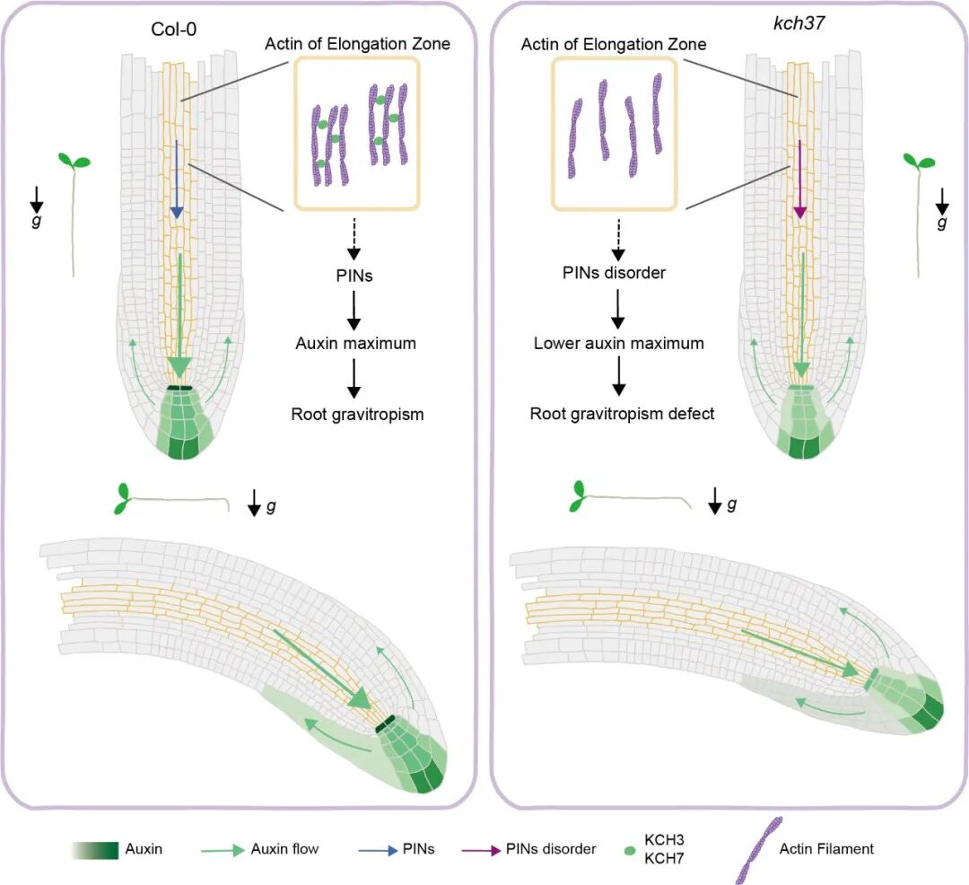 研究发现,KCH通过调控根中柱细胞内微丝骨架的结构和动态,促进根尖生长素浓度梯度的建立,从而调控根的向重力性反应。该研究拓展了以往认为微丝骨架通过影响淀粉体沉降调控向重力性的认知,为全面理解微丝骨架在根向重力性中的作用提供了新见解。