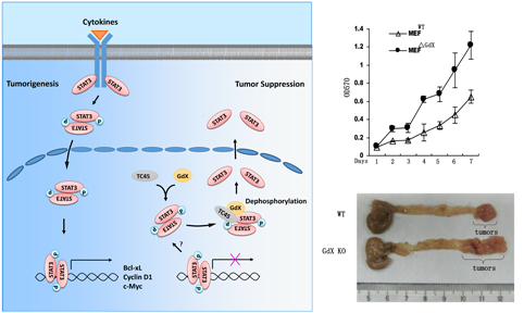 图片说明:肿瘤细胞受到细胞因子刺激后,STAT3被激活并引起肿瘤相关基因的表达,导致肿瘤发生。当细胞存在一个泛素结构域蛋白GdX时,这个蛋白便特异地把一个磷酸酶TC45带到STAT3蛋白上,从而引起STAT3蛋白发生去磷酸化作用,导致其致癌功能失活,从而产生了抑制肿瘤作用(左图)。当敲除GdX后,细胞的增殖明显加快(右上),而这样的敲除小鼠结直肠癌的发生明显增高(右下)。