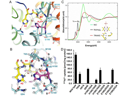 杨茂君研究组通过晶体结构生物学手段,解析了第一个离子类ECF转运体底物结合蛋白NikM的1.83埃的分子结构,从原子水平上阐释了NikM特异性识别镍/钴离子的机理。分子结构提示NikM的N端九个氨基酸形成的loop区对其特异性的识别镍/钴离子具有至关重要的作用,此loop区可与周围氨基酸形成了有方向性的氢键网络,以稳定结合镍/钴离子时的分子构象,同时Met1,His2和His67直接参与了镍/钴的结合,形成了平面四配位底物结合位点(图A,B)。体外XANES(X射线吸收近边结构)实验揭示了即使在溶液状态下,NikM也是通过平面四配位的底物结合位点识别镍/钴离子(图C)。放射性同位素Ni63标记的体内转运实验阐明,N端loop区的氢键网络对镍/钴的转运活性具有必不可少的作用(图D)。基于高分辨率结构的量子化学计算发现NikM对存在3d轨道杂化的过渡金属离子具有更强的结合能力,且其中以镍和钴最强,进而提出了NikM的底物如何被特异性识别的机制。