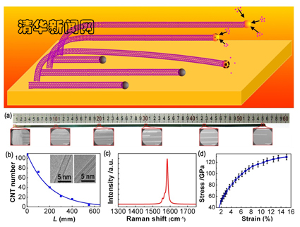 图为超长碳纳米管生长机制、超长碳纳米管照片、长度分布、拉曼光谱和应力应变曲线。