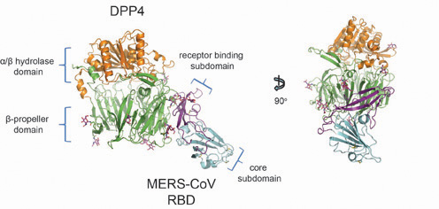 图为MERS-CoV RBD与人受体DPP4胞外结构域复合物的三维结构。