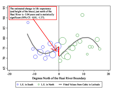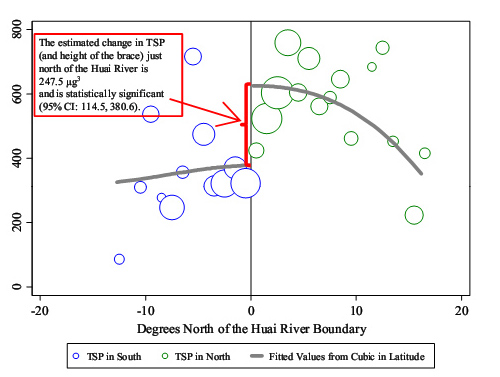 李宏彬的这项研究巧妙地利用中国独特的淮河取暖分界线,解决了准确估计因果关系的难题。中国的空气污染有一个有趣的模式,由南到北,污染水平平滑地变化,但是由于南北方供暖政策不同,在淮河附近有一个巨大的跳跃。冬季大量燃煤供暖使得淮河北岸空气中的总悬浮颗粒物比相邻的南岸跳跃性地高出200微克/立方米,同时期人均预期寿命也在淮河南北两岸表现出突变,北方比南方少5年之多。这一突然的跳跃为研究空气污染与健康的关系提供了一个理想的自然实验,几位经济学家运用间断点回归方法估计污染对健康的因果影响。同时,由于在上个世纪的大部分时间里,中国城市居民很难跨城市迁徙,这使研究样本在很大程度上避免了人的选择性迁徙带来的偏差。