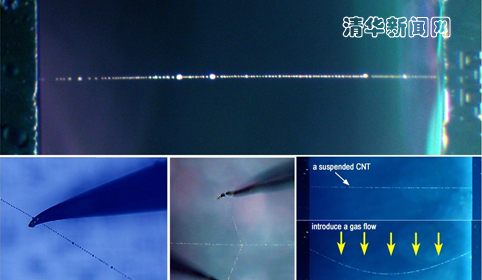 为攻克这个技术难关,清华大学化工系与微纳米力学与交叉学科研究中心(CNMM)的研究团队先在硅片(带刻槽)上生长密度较低的20-50cm的超长碳纳米管,然后控制四氯化钛在空气(含微量水蒸汽)中水解,从而在碳纳米管表面沉积数十至数百纳米大的二氧化钛颗粒。这些颗粒对可见光有很强的散射能力(遵循米氏散射),使单根碳纳米管在光学显微镜下能够被清晰地观察并准确定位,并可进行单根碳纳米管的任意拉伸、剪切、转移等各种操纵控制。该沉积方法不需要复杂设备,只需要几秒钟就可完成,简单高效,大大提高了碳纳米管的结构表征、性能测量以及器件构建效率。
