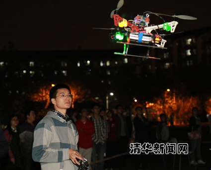 “四旋翼飞行器的技术核心包括了姿态航向参考系统、飞行控制器、GPS模块三大主要部分。四旋翼姿态航向参考系统包括了加速度计、陀螺仪、磁罗盘、气压计等传感器,用于测量飞行姿态和高度;飞行控制器利用姿态航向参考系统测量的信息,控制四个螺旋桨的转速,进而控制四旋翼的姿态,保证四旋翼的稳定飞行。在我们团队进行飞行表演的四旋翼飞行器上,前两部分都是团队的同学们自主设计制作的。”嵌入式兴趣团队队长、清华大学自动化系硕士生杨盛介绍道。