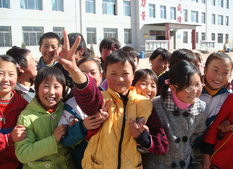 贫困县孩子们向清华的扶贫教师绽放开心笑容。
