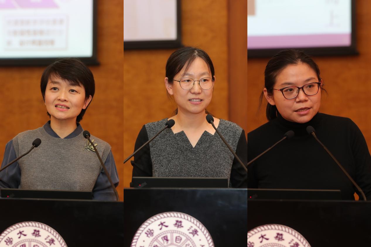 王红、杨帆、汪潇潇(从左至右)汇报工作