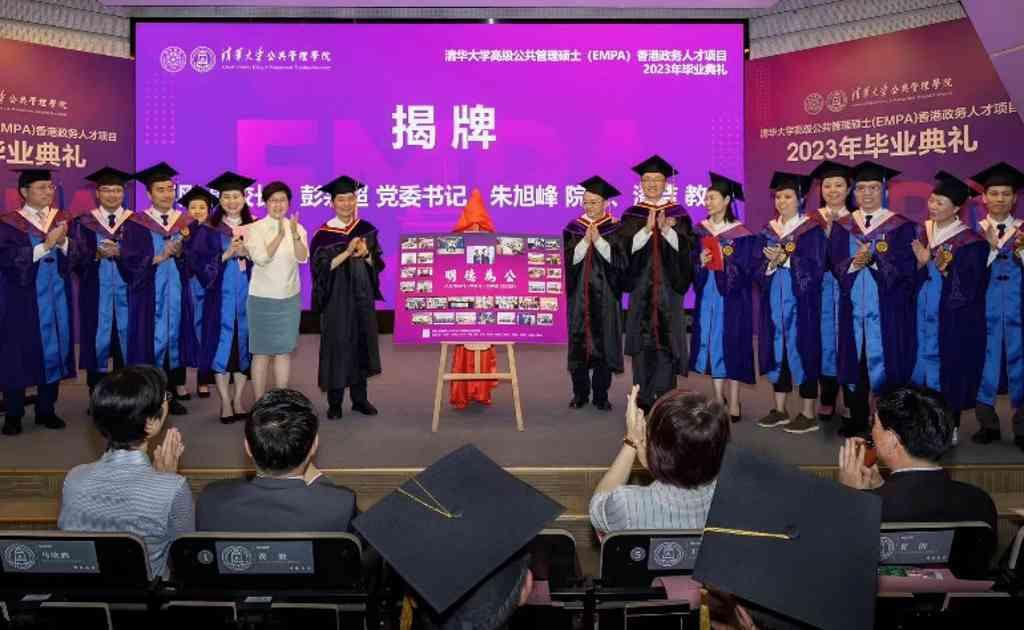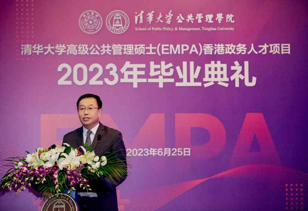 彭刚代表清华大学向国家有关部委、香港特区政府有关部门、所有关心和支持EMPA香港政务人才项目的各界人士致以诚挚感谢,并对毕业生和公管学院表示热烈祝贺。他指出,EMPA香港政务人才项目是为服务香港特区新时期“一国两制”和“爱国者治港”大局,助力粤港澳大湾区国家战略而创设。多位同学受到香港特区政府和立法会委任、获得特区政府嘉奖,参与全国案例大赛并获奖。2023年是全面贯彻落实党的二十大精神开局之年,也是香港回归祖国26周年,希望同学们秉承清华大学“自强不息、厚德载物”的校训、发扬公管学院“明德为公”的精神,积极投身“一国两制”事业,为中华民族伟大复兴作出清华人的贡献。
