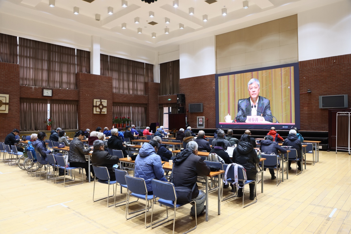 校机关离退休教职工党员钱锡康安静地坐在会场最后一排认真聆听讲座,旁边紧挨着的是他的轮椅。今年87岁的钱锡康行动已经不便,但有着67年党龄的他,仍坚持来到现场参加全体党员集中培训学习。