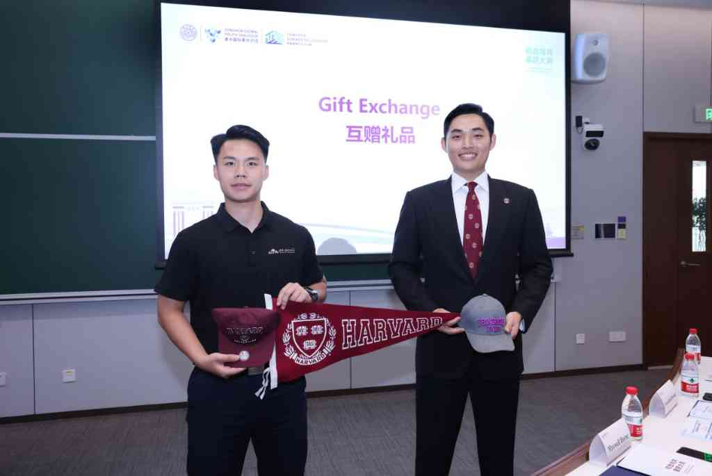 随后,理查德·董与清华大学研究生会副主席王智慧代表两校青年互赠纪念品。