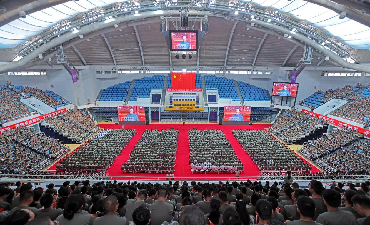 9时,清华大学综合体育馆、新清华学堂内,近4000名正在参加军训的本科生新生、约1500名研究生新生翘首以盼,共待荣光时刻。在各单位的自发组织下,校园各处都有师生们集体观礼,同上一堂生动珍贵的思想政治教育课和爱国主义教育课。