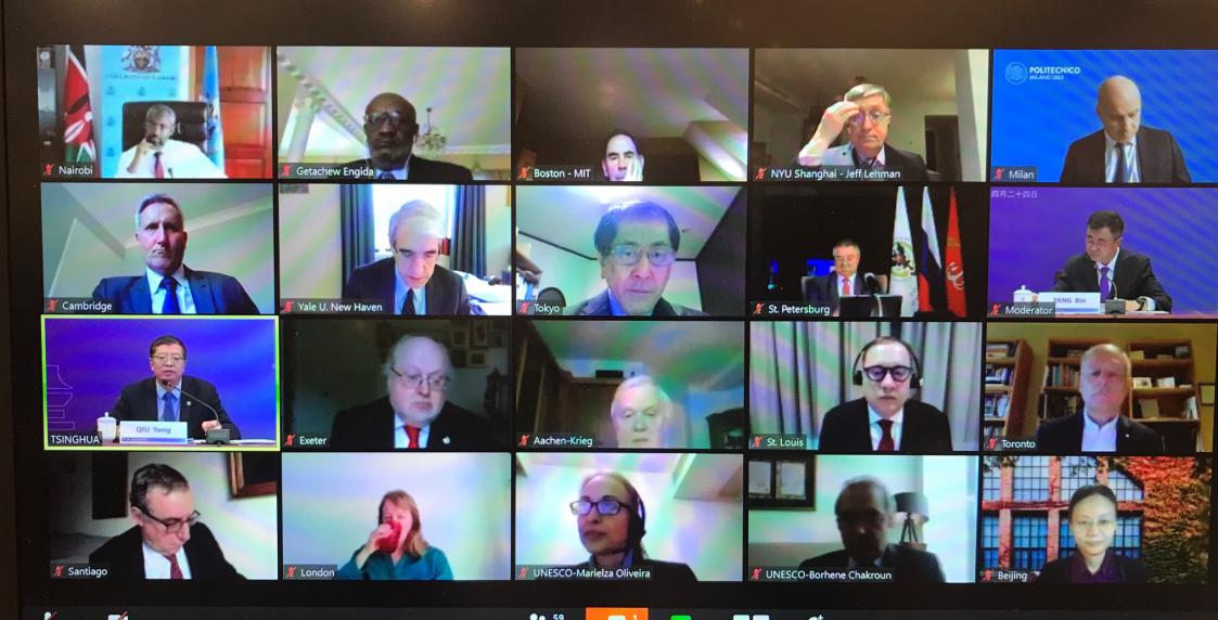 清华大学校长邱勇与耶鲁大学、剑桥大学、帝国理工学院、米兰理工大学、多伦多大学、早稻田大学、圣路易斯华盛顿大学、澳大利亚国立大学、智利大学、埃克塞特大学、马来亚大学、内罗毕大学、圣彼得堡国立理工大学、麻省理工学院、亚琛工业大学、上海纽约大学、韩国科学技术院、布宜诺斯艾利斯大学、蒙古国立大学、蒙古科技大学等多所高校校长、副校长和专家学者,以及联合国教科文组织多位代表相聚“云端”,共商全球疫情蔓延下的在线教育挑战与变革,共谋交流合作新发展。近百位UNESCO全球代表处官员、国内外专家学者以及媒体代表旁听会议。