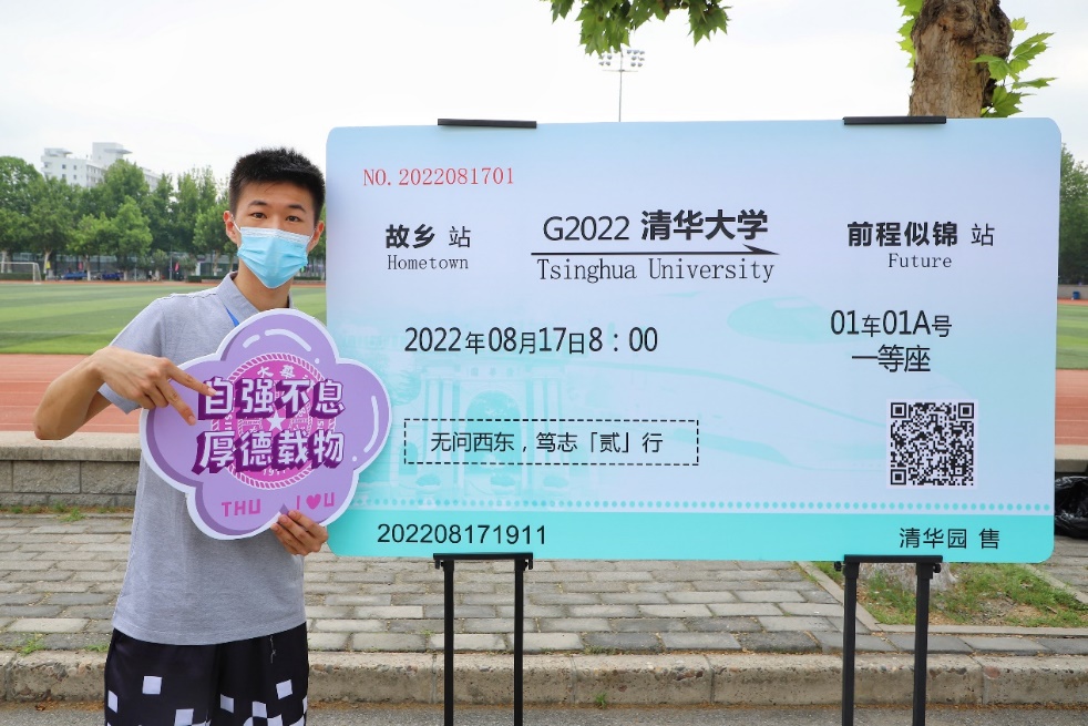 上午9点左右,在紫荆公寓前的迎新主干道上,G2022清华大学次列车车票展板吸引了一群“二字班”同学,他们摆出花样姿势与车票合影留念。
