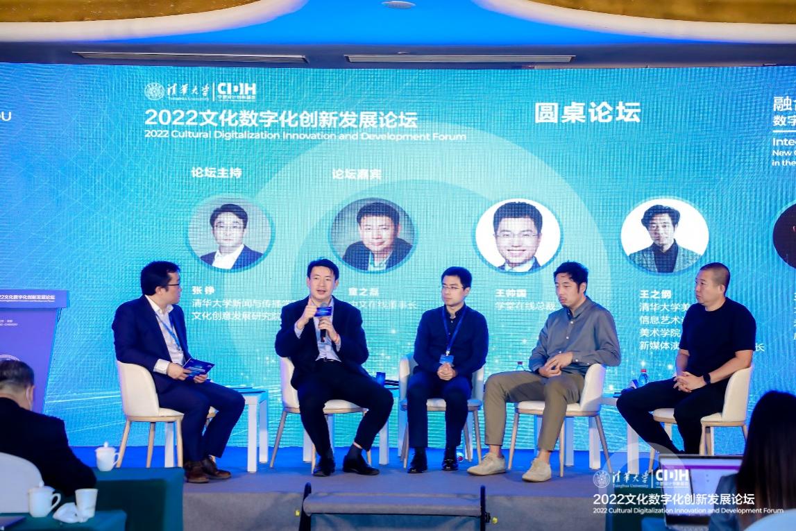 随后,清华大学新闻学院副院长张铮主持了圆桌论坛环节,中文在线董事长童之磊,学堂在线总裁王帅国,清华大学美术学院教授、信息艺术设计系主任王之纲,北京电影学院科研信息化处副处长王春水围绕落实国家文化数字化战略工作、构建文化数字化创新产业生态与交流合作平台等方面进行了精彩互动和对话。