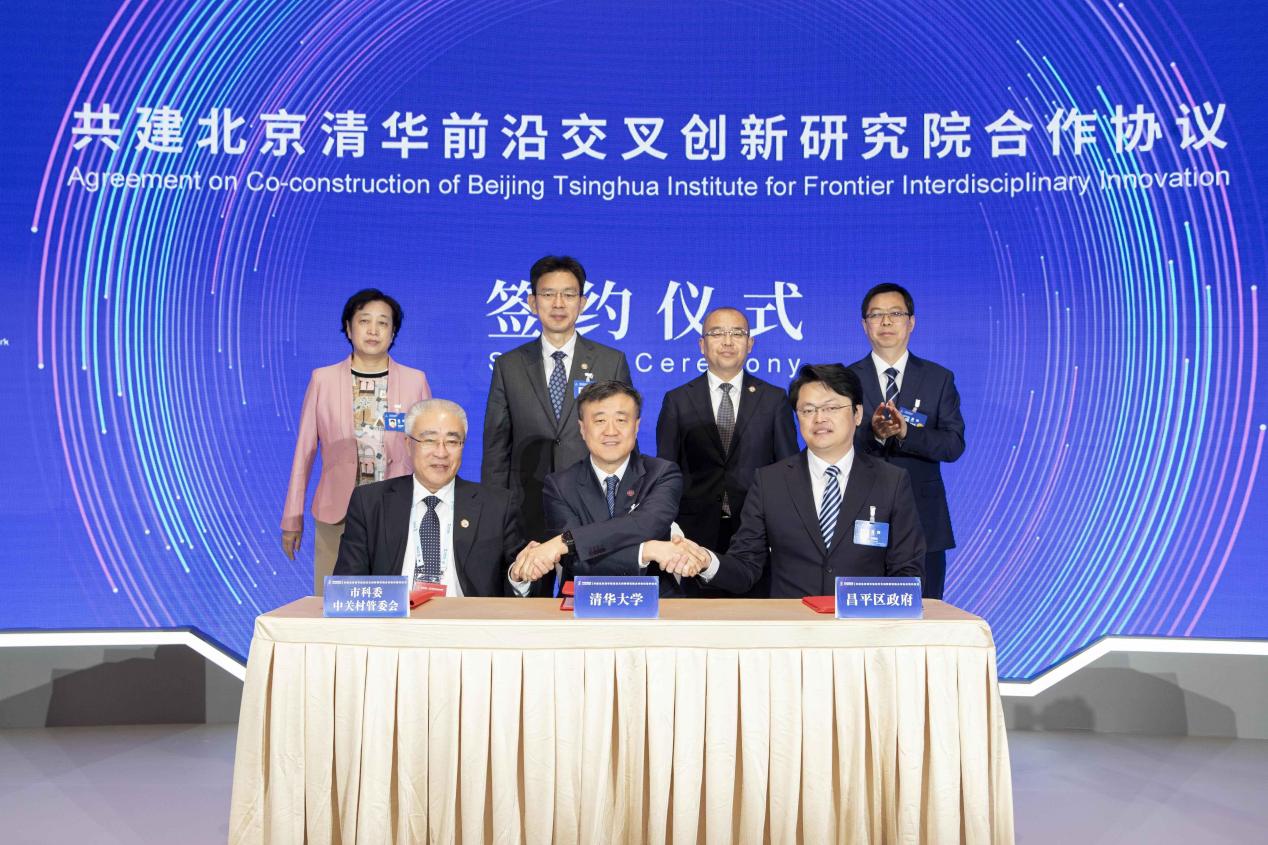 刘晖、刘晓东、杨斌分别代表北京市委科委中关村管委会、昌平区、清华大学签署合作协议。