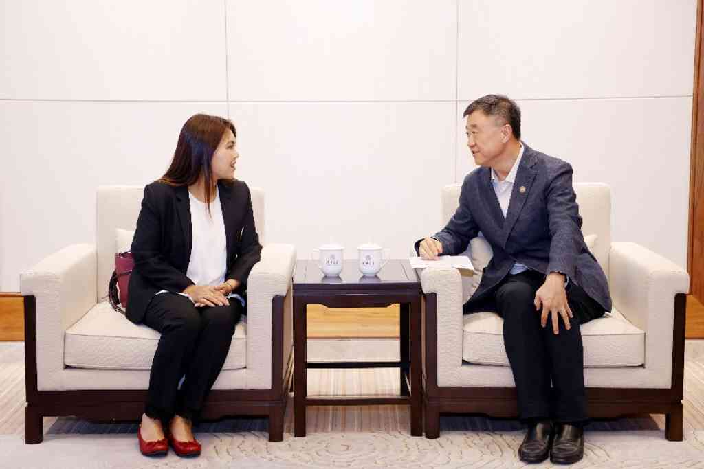 杨斌对帕兰妮·阿玛拉诺德一行到访表示欢迎,回顾了两校的长期友好合作关系,并介绍了清华大学在全球战略、学科建设、学生培养等方面的最新进展。他表示,两校在亚洲大学联盟、学生交换和在线教育等多方面都有着密切合作。明年是中泰建交50周年,希望值此契机,两校在经济管理和STEM(科学、技术、工程和数学)等多学科领域的联合学位培养项目上进一步加强合作,推进师生交流,培养具有全球胜任力的创新人才。