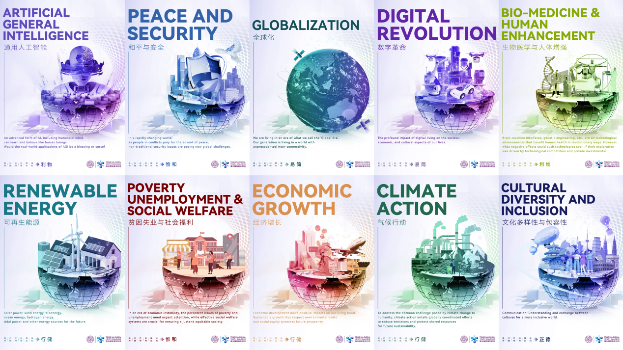 本届国际对话之前,来自78个国家和地区的1362名青年参与了“清华青年全球关切调研”,围绕“易简”“行健”“正德”“利物”“厚生”“惟和”6大主题,评选出了最受关切的十大议题:通用人工智能、可再生能源、和平与安全、贫困失业与社会福利、全球化、经济增长、数字革命、气候行动、生物医学与人体增强、文化多样性与包容性。
