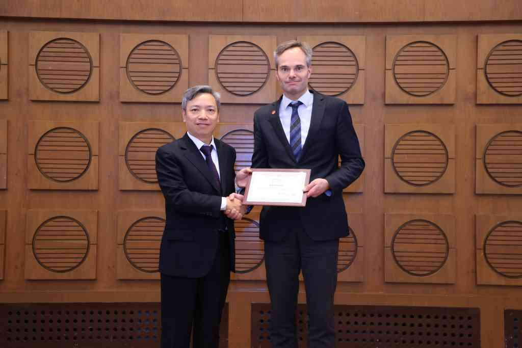 环境学院党委书记王灿向凯·米凯宁颁发了清华论坛纪念证书。