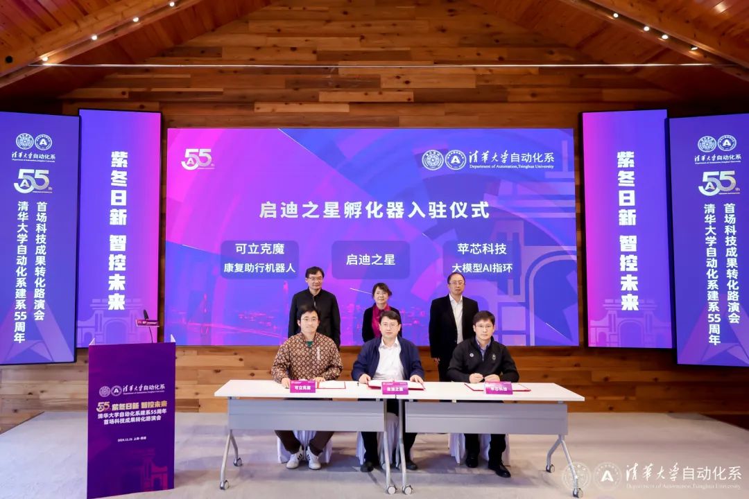可立克魔联合创始人何来晨、苹芯科技CEO杨越与启迪之星(上海)总经理王维现场签约入驻启迪之星(上海)孵化器,清华大学自动化系党委副书记石宗英、杨浦区科技和经济委员会主任李正明、张金生共同见证。