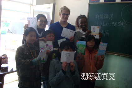 当天中午,志愿者们从学校出发,有的甚至来不及吃午饭,经过2个多小时的车程,志愿者们于来到了清红蓝子弟小学。面积不大的校园、几间低矮的平房、窄小的教室……这些简陋的条件不但没有影响留学生们对支教的热情,反而增加了他们为孩子们做些什么的决心。他们面带微笑地上前与孩子们打招呼,而没有近距离接触过“金发碧眼”和“非洲兄弟”的孩子们都惊奇地涌上来,礼貌地把留学生们请进教室。