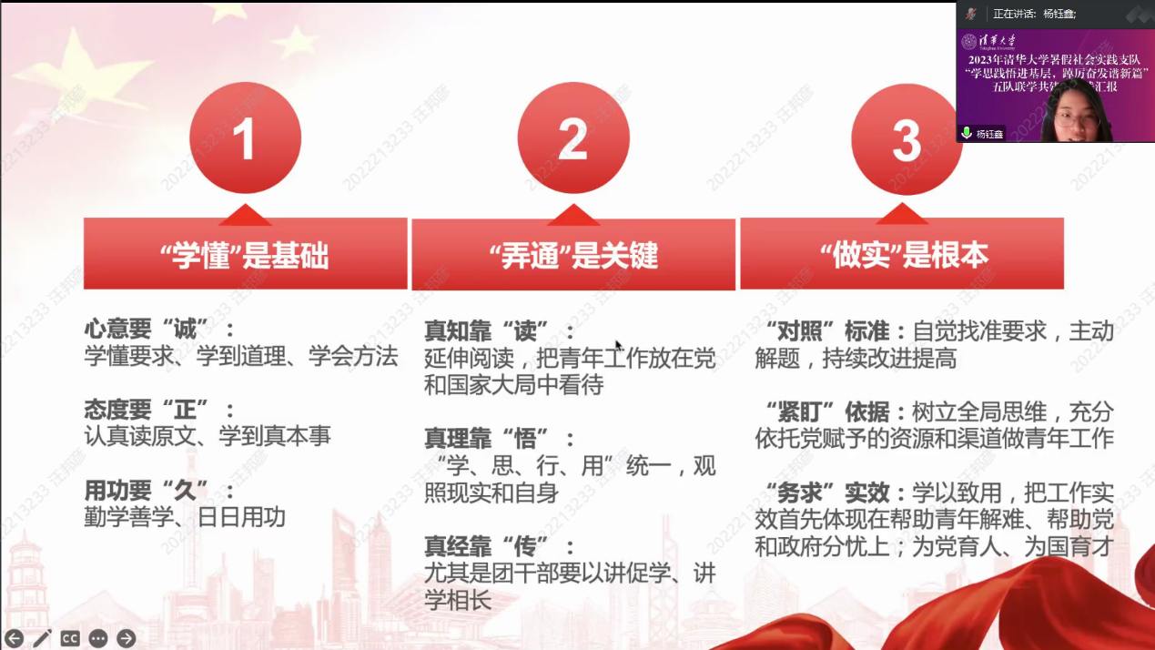 活动伊始,五队同学共同进行理论学习。围绕习近平总书记关于青年工作的重要思想、当代青年如何在社会实践中与新时代同向同行,清华大学博士生讲师团金牌讲师杨钰鑫为大家作“《论党的青年工作》导读”理论宣讲。
