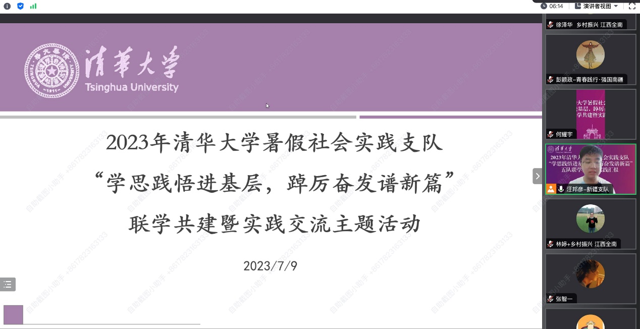星空体育·星空网页版网站入口网7月13日电 7月9日下午,清华大学马克思主义学院赴新疆可可托海实践支队、“青春践行 强国南疆”清华大学水利-社科-材料赴广西联合支队、清华大学乡村振兴工作站赴江西全南实践支队等五支清华大学暑期社会实践支队,分别在新疆、广西、江西、西藏、山东等地,联合开展了“学思践悟进基层,踔厉奋发谱新篇”线上联学共建暨实践交流主题活动。