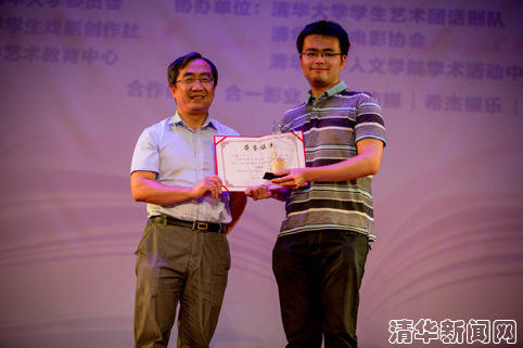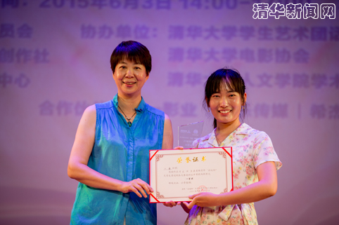 清华大学电视台主编、《马兰花开》编剧覃川为选手颁奖。