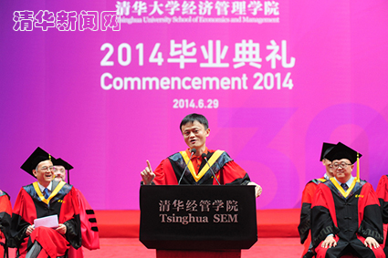 清华经管学院顾问委员会委员、阿里巴巴集团主席马云是本次毕业典礼的演讲嘉宾。在演讲中,马云跟毕业生们分享了自己在之前30年中的三个坚持:坚持理想主义,坚持有担当精神,坚持乐观的正能量。他还分享了他的座右铭——今天很残酷,明天更残酷,后天很美好,但是绝大部分人“死”在明天晚上。他鼓励经管毕业生面对残酷的竞争,努力战胜现在的自己。