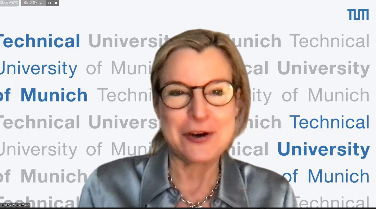 朱莉安·温克曼在致辞中表示,“Tsinghua-TUM Talks”是一年一度的系列活动,于2020年底试行。去年,两校的知名学者向听众介绍了人工智能领域的最新发展情况。今年,嘉宾们将重点关注可持续发展的价值观如何在大学相关的背景下推动创新,以及中德两国创业人才如何在创新过程、产品开发和业务中反映可持续发展的理念。朱莉安·温克曼表示,慕尼黑工业大学与清华大学的密切合作伙伴关系共同致力于教育和培养下一代世界一流的科学家和创业人才,他们的发明与新技术的应用将在全球范围内产生影响。她强调,在两校旗舰型合作伙伴关系中的各项举措,无疑将挖掘两校的巨大合作潜力,并为两校创造合作和理解的平台。