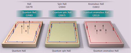 量子霍尔家族(括号中的数字表示对应的效应发现的年代)。H表示外加磁场强度,M表示自发磁化强度。这三种量子霍尔效应中,电子都是沿着无耗散的边缘运动,材料内部是绝缘的。霍尔测量是测量一个方向的“净”电荷,对于量子霍尔效应(左侧)来说,边缘的不同自旋方向的电子都是朝着一个方向运动;对于量子自旋霍尔效应(中间)来说,不同自旋方向的电子的运动方向不同;在量子反常霍尔效应(右侧)中,沿边缘运动的只有自旋向下的电子。自旋和电荷运动方向的“锁定”机制和边缘通道的数量取决于材料本身,这里只说明了最简单的情况。