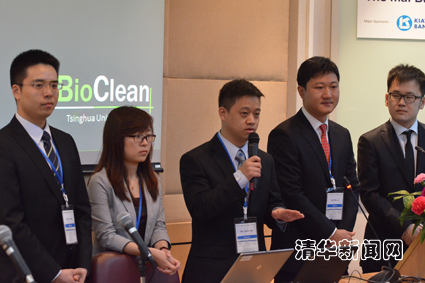 比赛中,由清华大学环境学院2011级硕士生张天元、朱树峰和经管学院2012级MBA P4班的武大治、黄咿婧、吕喆、薛言、牟虹帅组成的“Bioclean”代表队以环境学院胡洪营教授课题组开发的“污水再生处理与微藻生物质生产耦合工艺”为主题参赛,经管学院的代表队成员为该主题设计了商业推广方案,并做相应的财务及投资分析。参赛项目的核心技术是利用微藻对生活污水进行再生处理,在获得高质量“再生水”同时,生产生物柴油和饲料添加剂。该项目以污水为资源,实现了“再生水”生产和“生物质能”生产的有机耦合,大规模应用后可产生巨大的环境和经济效益,是备受关注的污水再生利用新技术。代表队的参赛作品得到了各评委的一致好评,最终在各代表队中脱颖而出,获得“Most Professional”奖项。