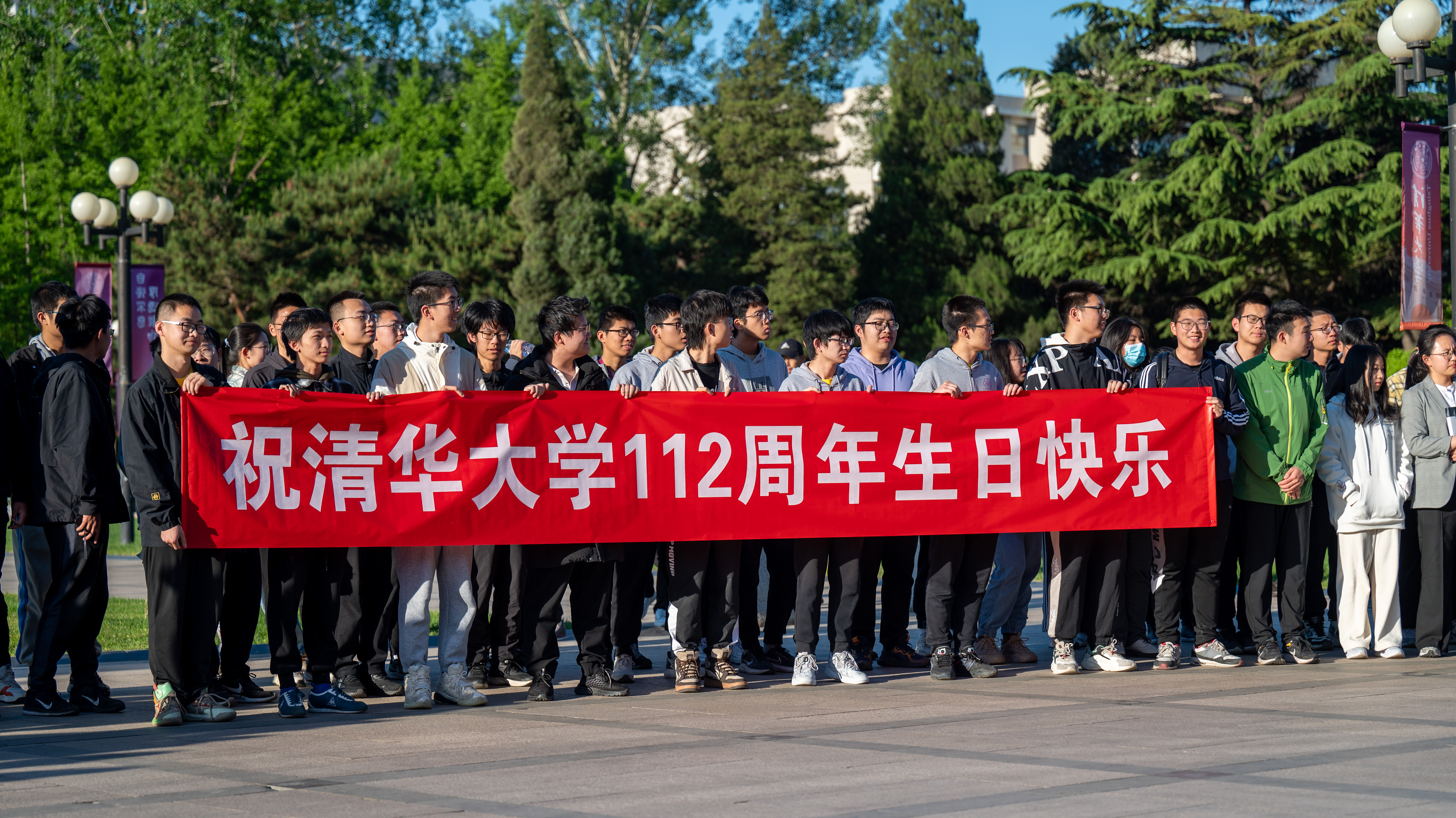 4月30日,迎着晨曦,清华大学112周年校庆日升国旗仪式在主楼前广场举行。师生校友肃然起敬,注视国旗升起,向国旗敬礼,为母校送上诚挚的生日祝福。