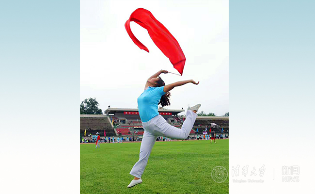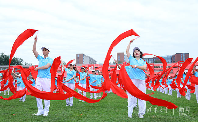 广播操之后,由清华大学工会健美操协会组织进行红绸健身操《欢聚一堂》的表演,来自36个分工会的健身爱好者和健美操协会的会员们组成了724人的队伍,鲜艳的红绸与青翠的草坪相映成趣,教职工们热情洋溢的活力和整齐流畅的表演赢得了全场观众的阵阵掌声。