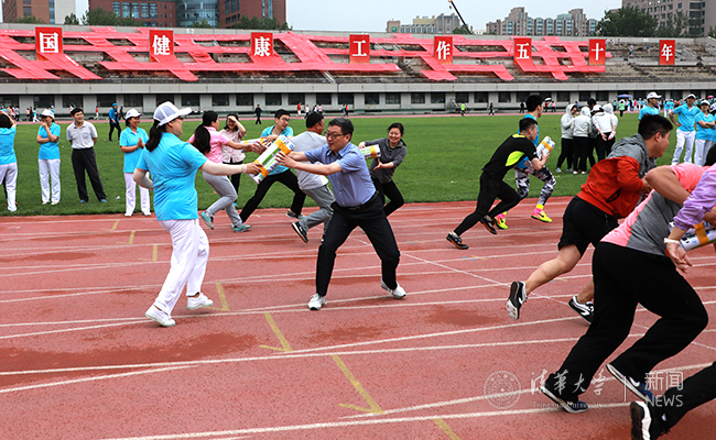 王希勤在致辞中表示,近年来我校教职工体育活动蓬勃开展,健走、登山、游泳、长跑、以及各种球类和棋牌类项目的比赛深受教职工欢迎。去年我校教职工围棋队、象棋队、羽毛球队均获得了高校比赛的冠亚军成绩。据不完全统计,我校每年参加校工会各种文体活动的教职工有3万多人次。“为祖国健康工作五十年”的口号深入每一个清华人的内心,成为清华人的一种承诺和担当。