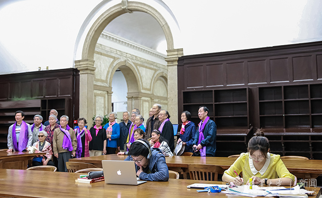 志愿者为老校友拍照