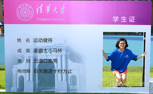 学生与学生卡合影板合影留念。记者 苑洁 摄