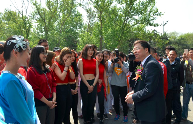 上午10点,邱勇校长来到新清华学堂广场观看学生社团表演,与同学们亲切交流。邱勇仔细询问了跆拳道协会会长、经管学院2012级本科生马世豪的学习生活情况,勉励大家弘扬清华的体育传统和体育精神。在同学们的盛情邀请下,邱勇校长一一走进街舞社、舞蹈协会等学生社团与艺术团军乐队,对同学们说:“你们向外界展现了多彩的清华,让社会看到了清华有多美”,并与学生社团成员们合影留念。