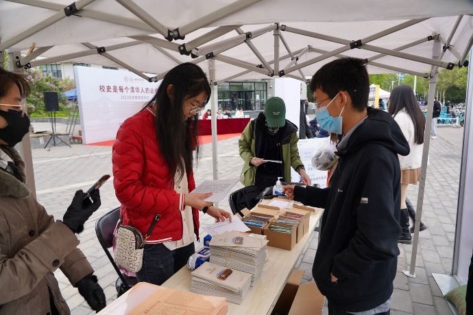 中午11点,校史“主题游园”正式启动,活动摊位前吸引了不少师生驻足体验。领取一本校史馆为大家精心准备的宣传折页,可以了解校史馆的基本情况和110年校史展览及馆藏亮点。展开折页,国立清华大学关防、西南联大教室场景、1948年12月清华园解放布告、清华师生参与密云水库设计和建设场景、2021年清华学子在东京奥运会获得的首枚金牌等10多件珍贵馆藏跃然纸上,提升了师生们对校史馆的认知度。