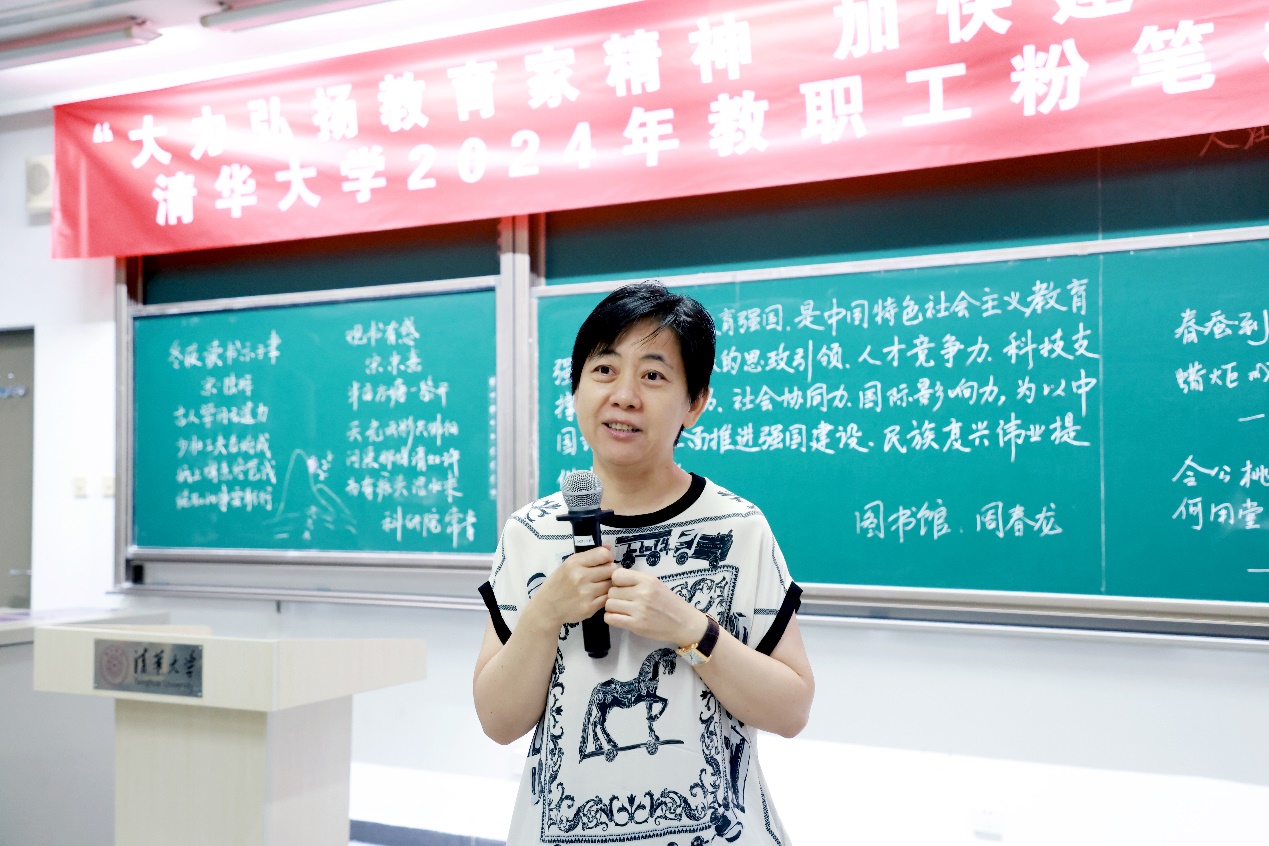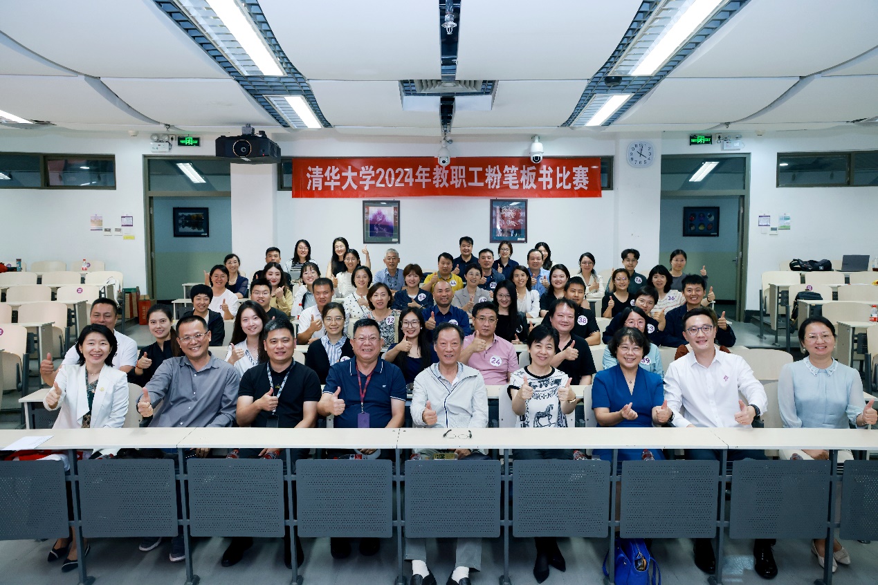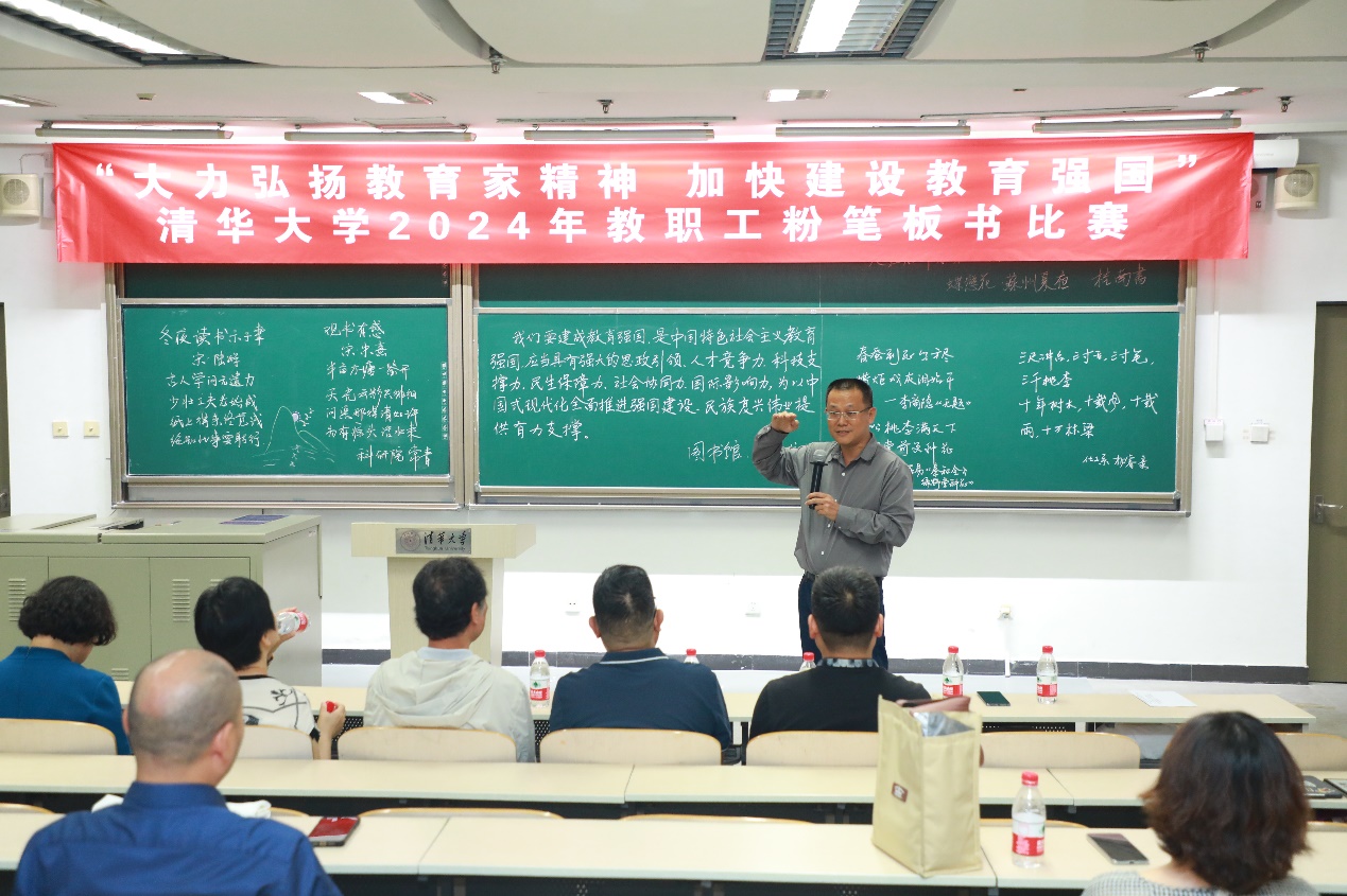 共有来自29个分工会的48位教职工参加比赛。其中,有14位参赛选手是2023年至2024年新入职的教职工。选手们需要在15分钟内完成板书创作。比赛分为两大组别,规定内容板书组临场抽签决定书写内容,比赛内容选自党的二十届三中全会精神、全国教育大会精神、清华大学章程、清华大学校歌以及经典诗文;自选内容板书组则由参赛选手充分发挥创意,比赛中的设计内容包括空气-水热湿交换过程的传热传质原理、特定处方药在古代不同文明时期的符号特点等,从中可以感受丰富多样、特色鲜明的理、工、文、医类大学课堂教学实景。