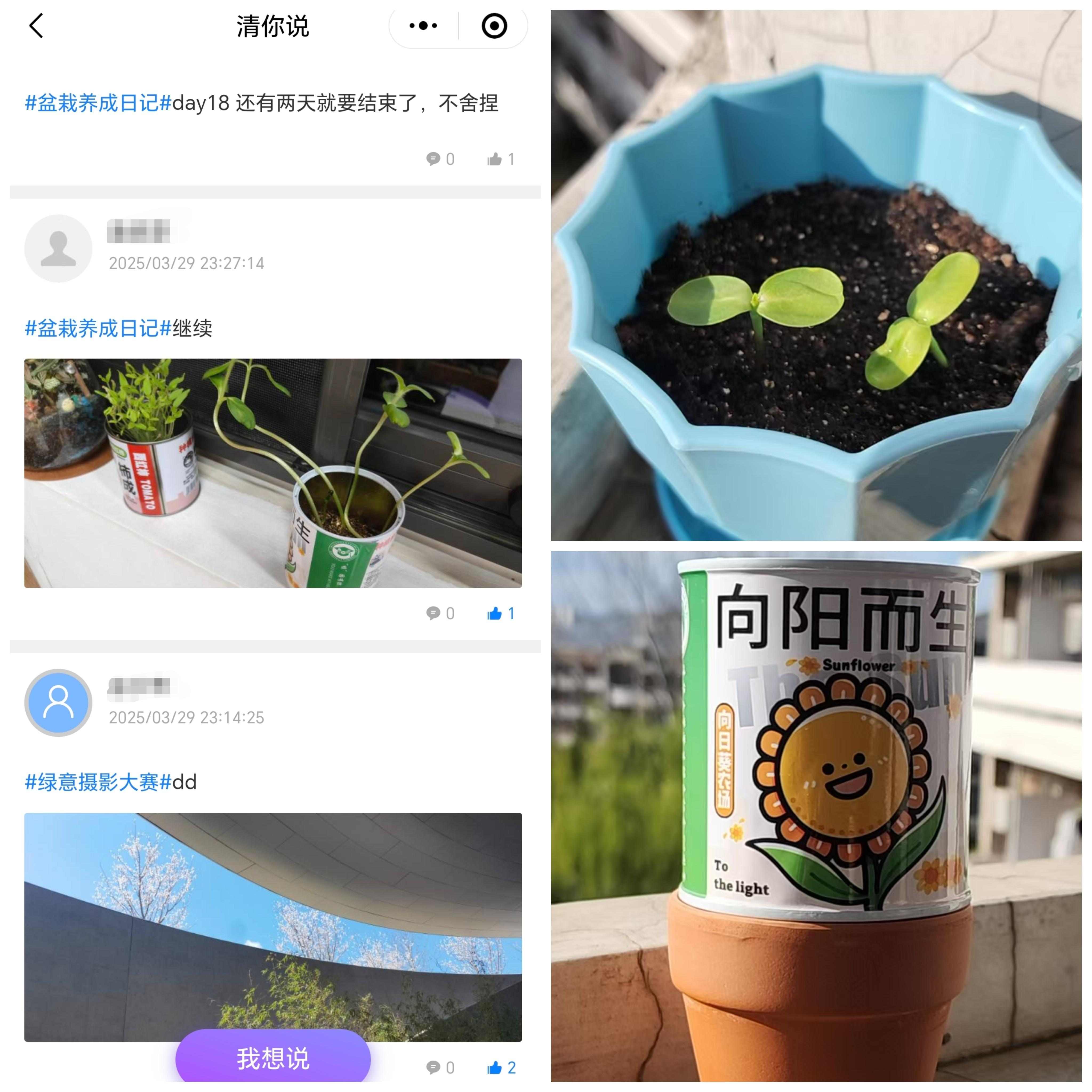 草长莺飞催春行,万象更新践“清”绿。清华大学研究生团委依托碳账户面板设置活动排行榜,推出“清华春物志”主题打卡,倡导同学们养成低碳生活习惯,设置“绿植合影”“环保创意作品展”“低碳生活实践”“盆栽养护记录”“春日绿意摄影”五个主题,累计打卡约1500人次。后续,清华大学研究生团委将持续优化碳账户面板,以信息化手段记录绿植养护、植树造林、步行运动中的减碳足迹。