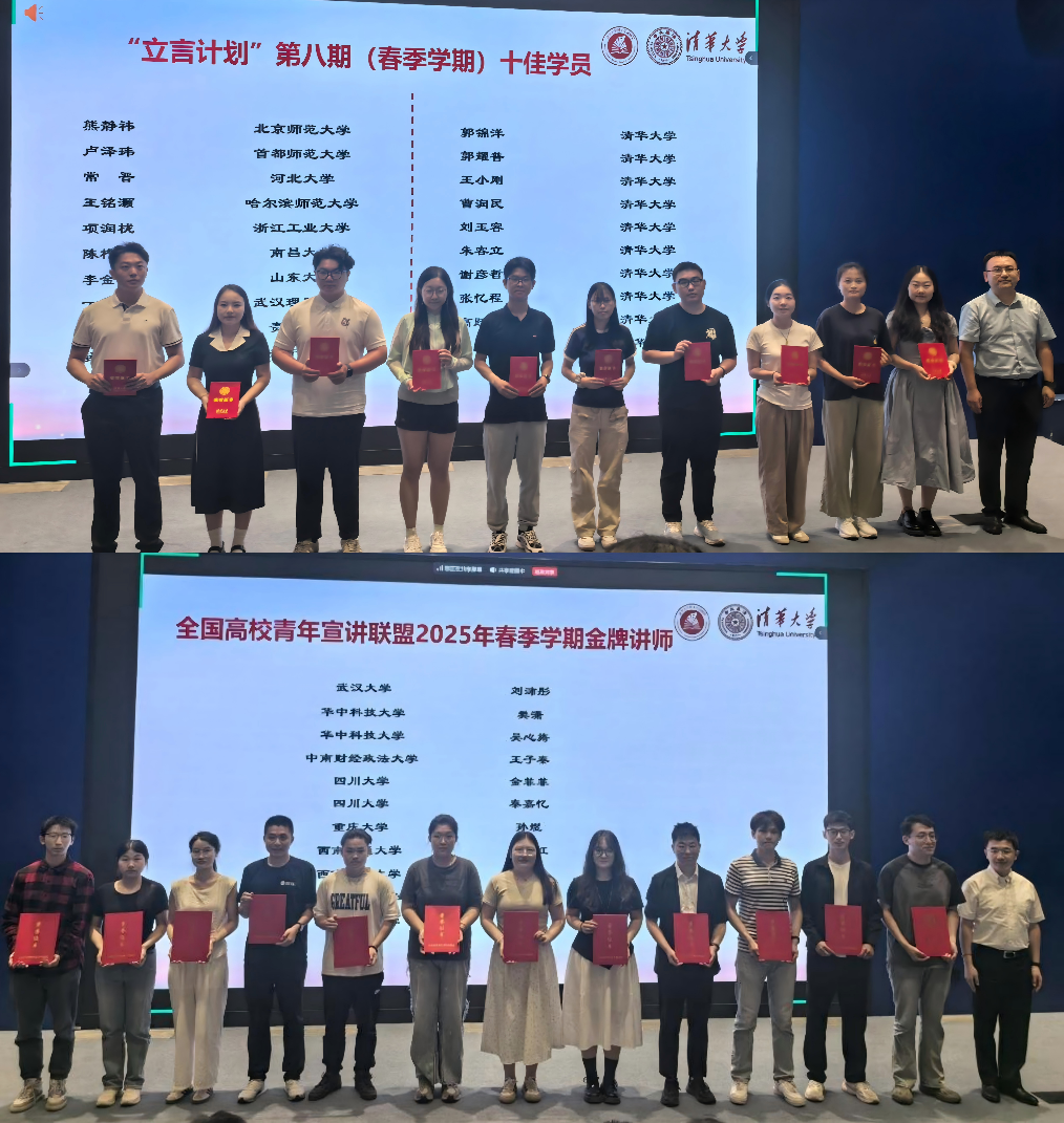现场为“立言计划”第八期(春季学期)“十佳学员”,博士生讲师团“星级分团”代表,全国高校青年宣讲联盟与清华大学博士生讲师团金牌讲师、高级讲师及精品课程获奖代表颁奖。