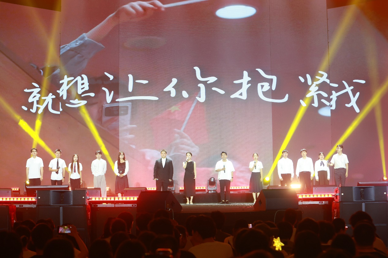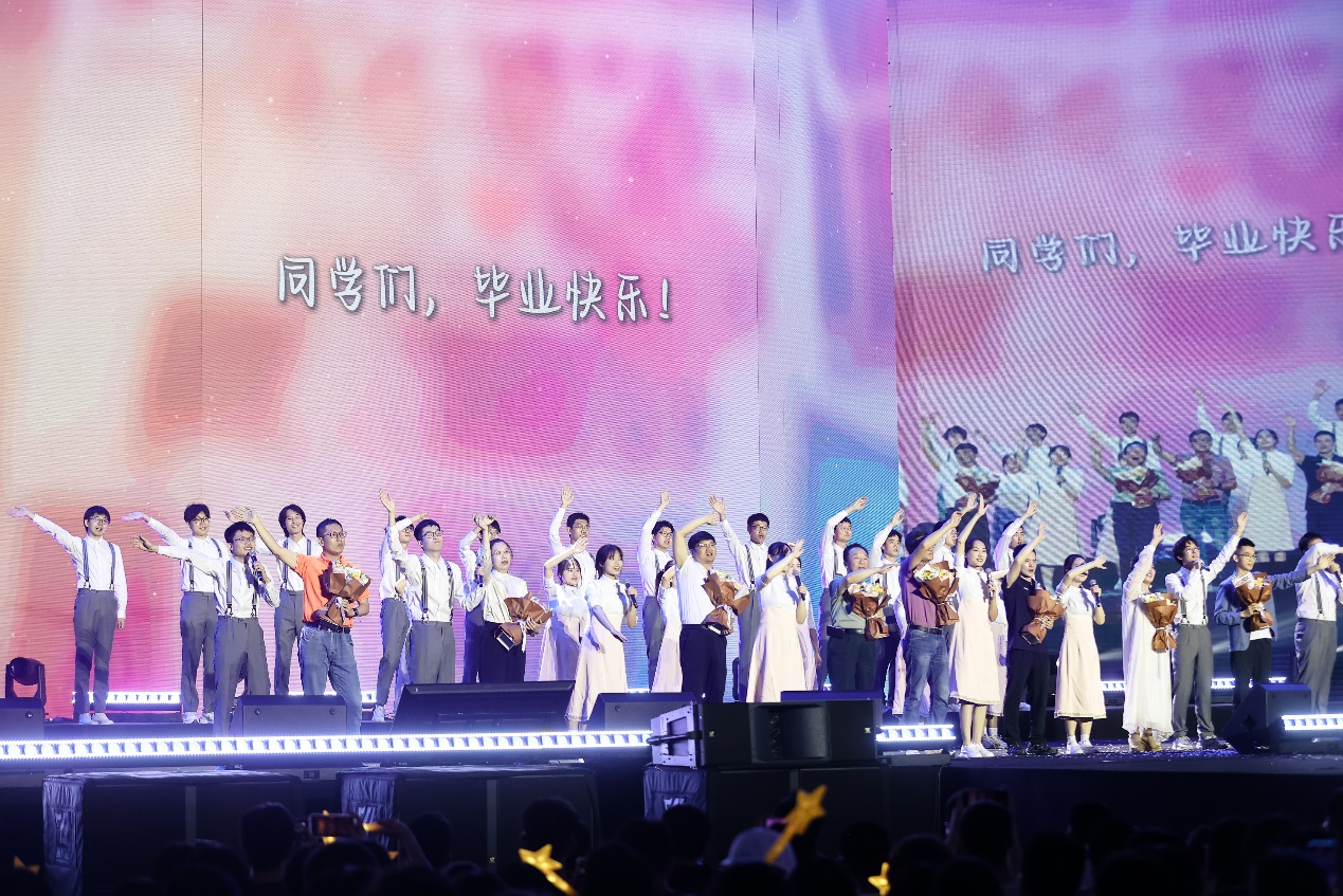 “心心相印”篇章以校友嘉宾水木年华乐团的《启程》《就算没有很伟大的梦想》《一生有你》三首曲目开场,道尽前行的坚定、平凡的温暖与同窗情谊的珍贵。临别之际,教师代表向毕业生们道出最后一声嘱咐与叮咛,并与学生艺术团合唱队共同唱响《明天会更好》。合唱《心光·时光》以纯净的声线和表演,将青春时光与心中光芒交织。全体师生起立齐唱校歌,熟悉的旋律再次响彻综合体育馆,每一个音符都饱含着对母校的深情。
