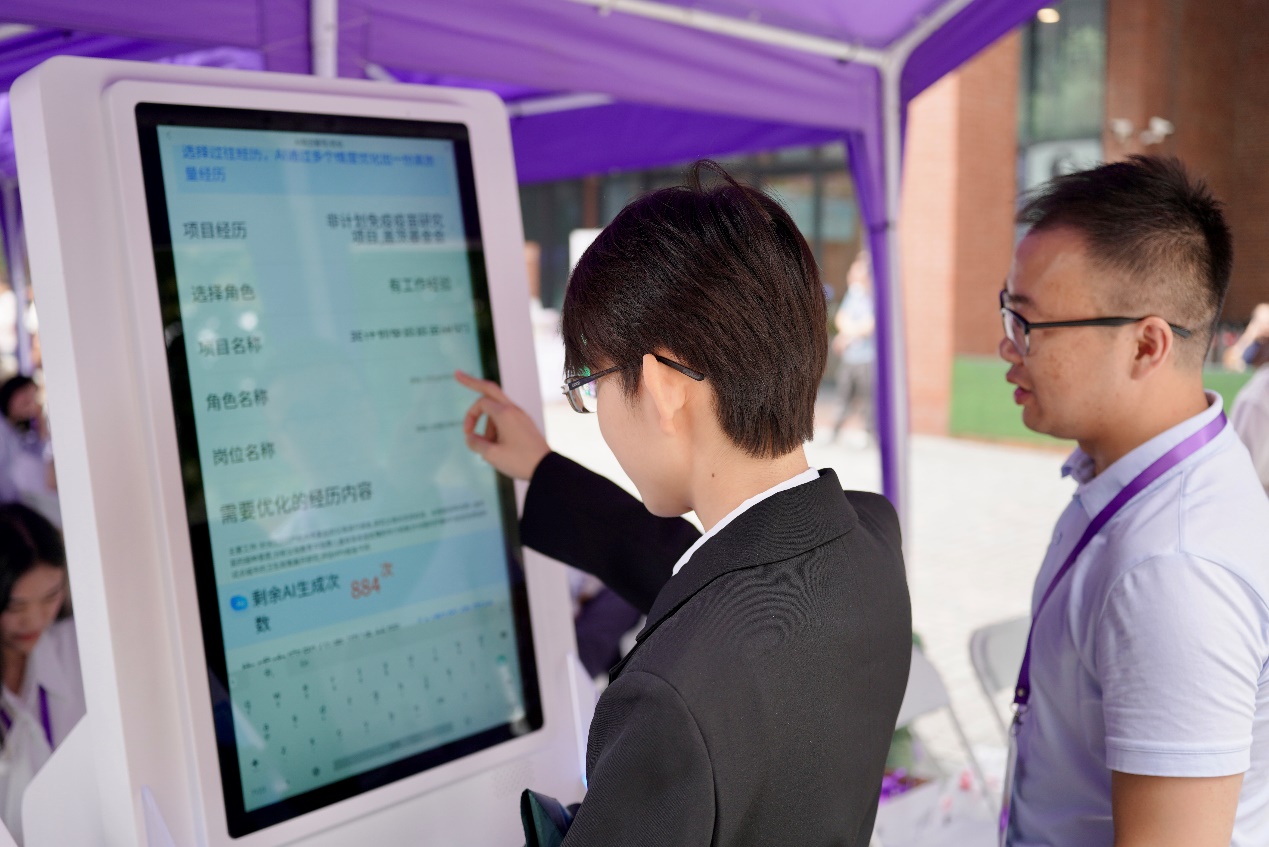 活动期间,人力资源工作者一对一指导学生逐项修改简历,讲授简历撰写规范和要点,并针对学生求职具体情况提供详尽解答和建议。活动现场还设置了英文简历修改和港澳台学生服务专区,提供更加精准有效的职业发展支持。值得一提的是,本次活动还引入人工智能简历一体机,同学们现场体验了简历优化、智写、打印等多项实用功能。