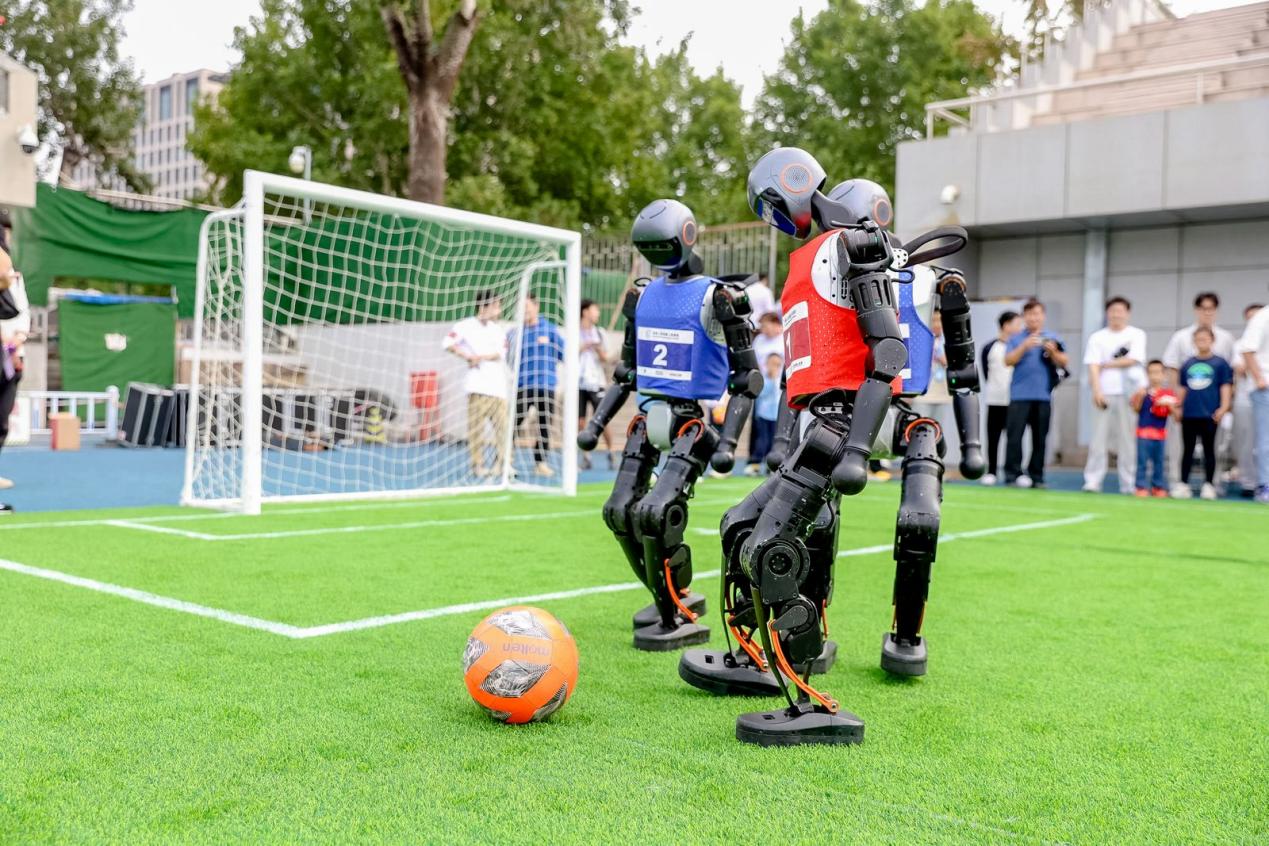 在东大操场南侧场地,今年新增的机器人足球赛项目吸引了大家的目光。清华大学“火神队”“Power智能队”和中国农业大学“山海队”的人形机器人分别进行比赛,展现人工智能与运动的深度融合,呼应“智体融合,科创未来”的赛会理念。