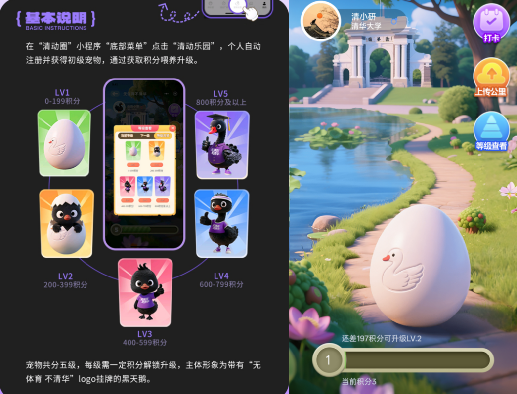 本届研运会还创新开发了“清动乐园”线上运动打卡平台,打造具有清华特色的“黑天鹅”IP形象,师生们以运动打卡获取积分养成专属电子宠物,通过社群化养成互动有效促进师生养成日常锻炼习惯。吉祥物“黑天鹅”和同款盲盒也惊喜亮相研运会现场。