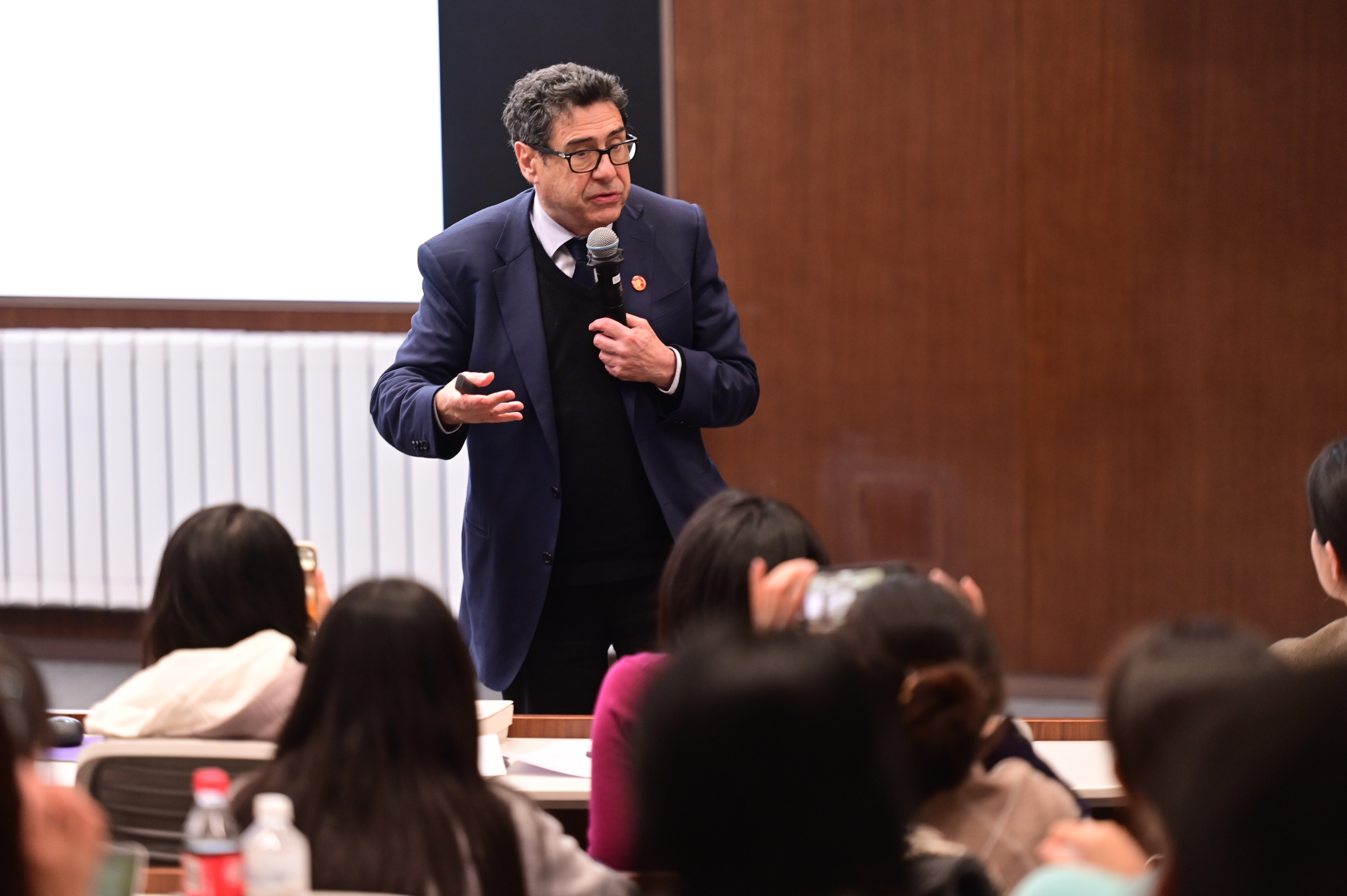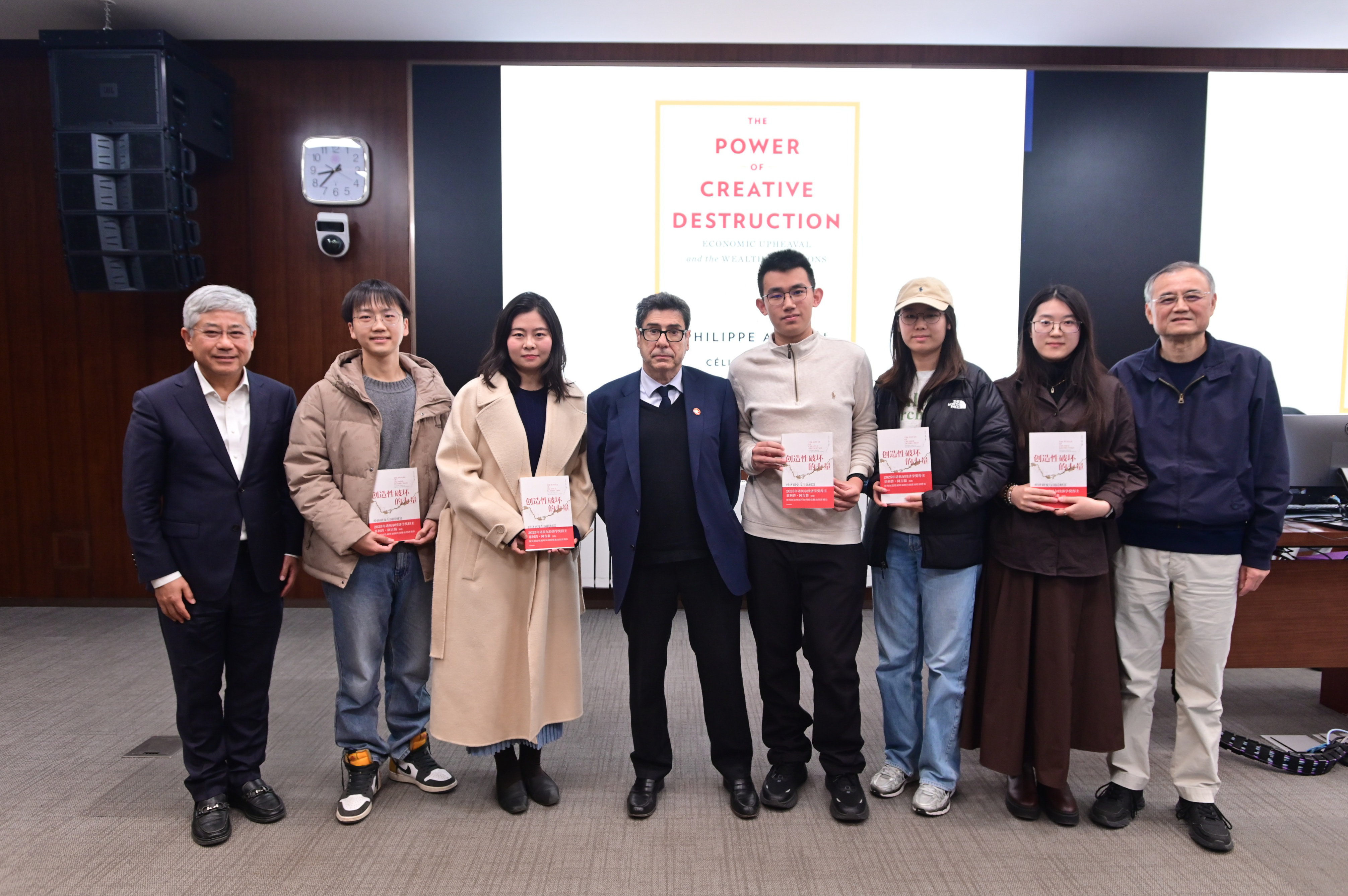 互动交流环节,菲利普·阿吉翁与现场师生围绕气候与能源转型、经济学家的核心素养等问题展开交流,并向参与互动交流的学生赠送亲笔签名著作《创造性破坏的力量》中文译本。