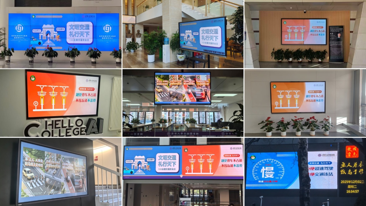为持续扩大宣传影响力,保卫处汇总整理交通主题宣传海报、警示教育视频等资料,为各单位开展宣传工作提供支持。全校50余家院系单位积极响应,充分利用办公楼、教学楼、宿舍楼等公共区域电子屏循环播放宣传内容,推动交通安全教育融入师生日常生活。此外,保卫处还通过“平安清华”网站、“行在清华”公众号等线上平台同步宣传,激发师生对交通安全的关注与参与,让安全文明交通理念浸润校园每个角落。